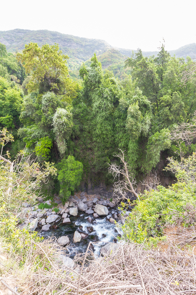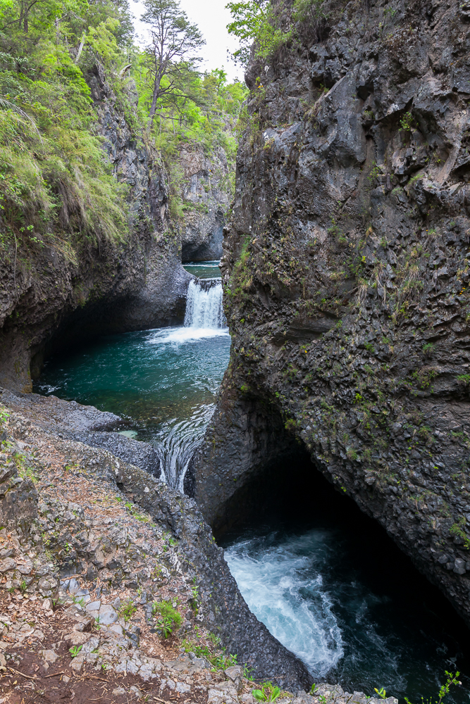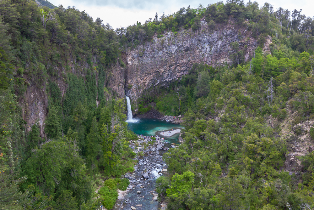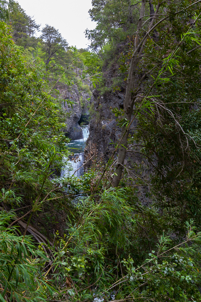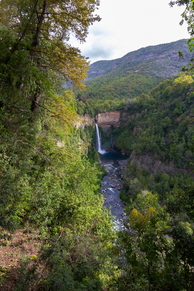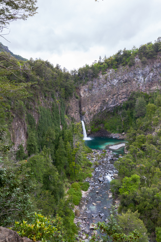 Der Nationalpark ist echt großartig. Auf ca. 1000 Meter Höhe – einem kleinen Hügel der Anden – ist alles mega grün und der Fluss Rio Claro hatte viel Zeit, die „Tassen“ zu formen. Eigentlich hätte der Eintritt für Ausländer auch 5000 Peso pro Person gekostet, der Parkwärter hatte dafür aber keine Quittungen, so haben wir den normalen Tarif von 2500 Peso für Chilenen bekommen. So gegen 16:30 Uhr waren wir dann mit der Tour fertig und sind die 7 km in Richtung Tal gelaufen. Dabei sind wir noch an „Velo de la novia“ vorbei gekommen, wo es auch großartig ist. Im Tal angekommen, kam dann auch der erste Bus – voll – und hat uns nicht mitgenommen. Der Galgenhumor hat uns da noch geholfen. Der zweite Bus ca. 30 Minuten später, so 19:20 Uhr und es war langsam „frisch“, war auch knacke voll. Aber man hat uns mitgenommen. Stehplatz im Gang bei einer Fahrt über Stock und Stein. Das Festhalten müssen hat den Muskelkater nicht besser gemacht. Wir waren trotzdem glücklich und erleichtert 🙂