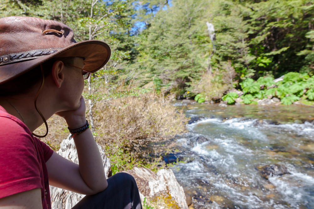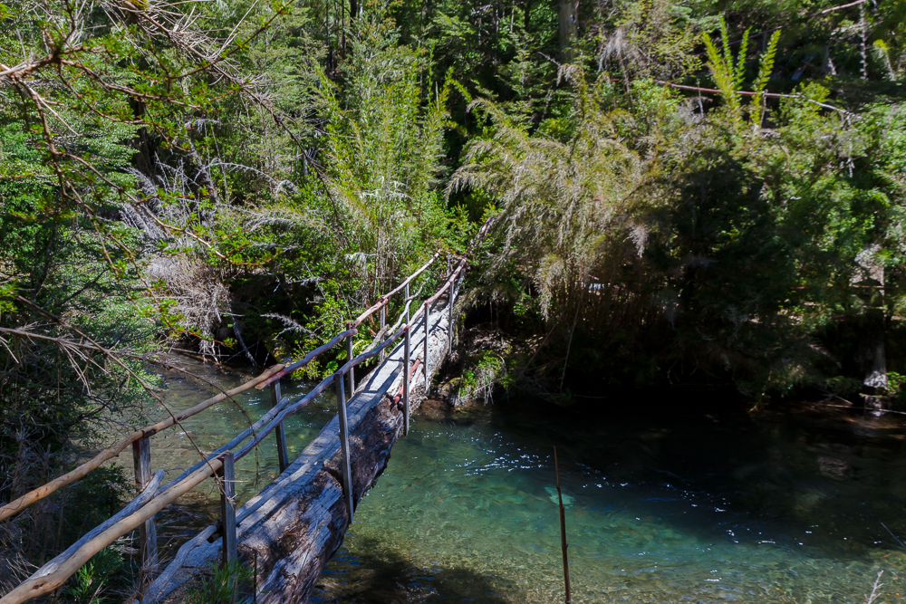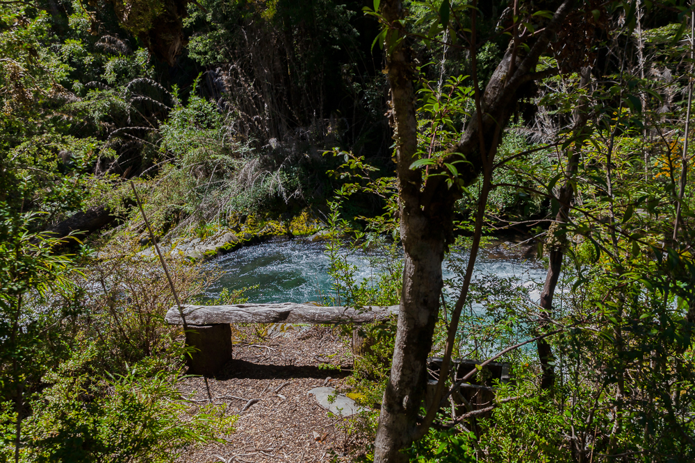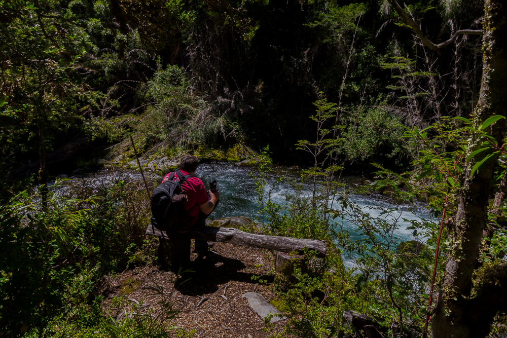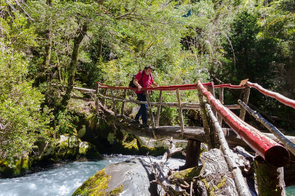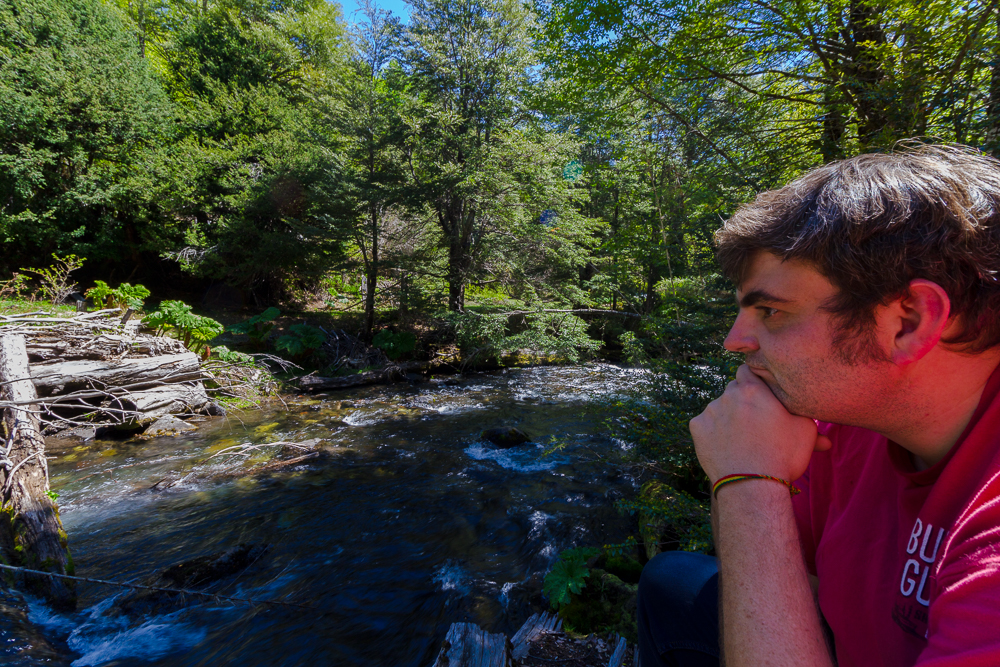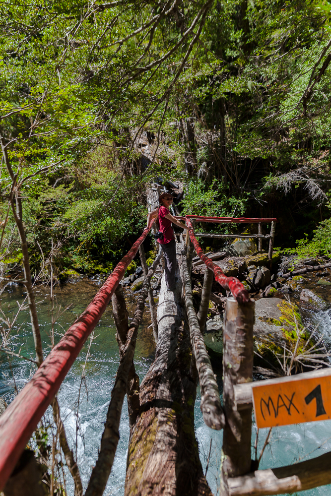 Den Samstag haben wir dann entspannt abseits aller Zivilisation angegangen. Nach dem Frühstück haben wir erst einmal ein wenig Postkarten und Reisetagebuch geschrieben und gegen 13:00 Uhr sind wir dann auf eine Wanderung durch den Wald aufgebrochen. Der Wald ist einfach toll, bis auf den kleinen Trampelpfad ist er nicht bewirtschaftet und ursprünglich. Über den Bach mit Wasser aus dem Eisfeld des nahen Vulkans führen nur dicke Baumstämme und zum Glück auch ein kleinerer Ast zum Festhalten.