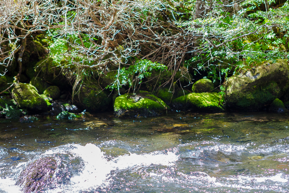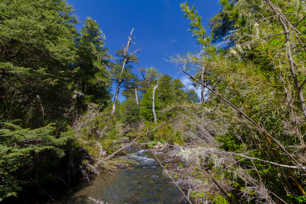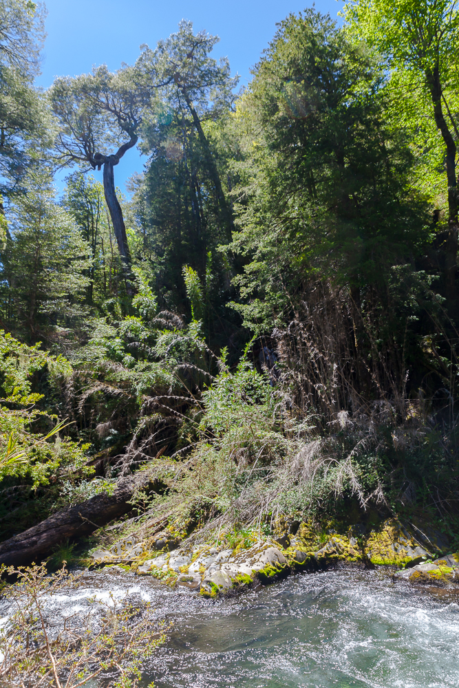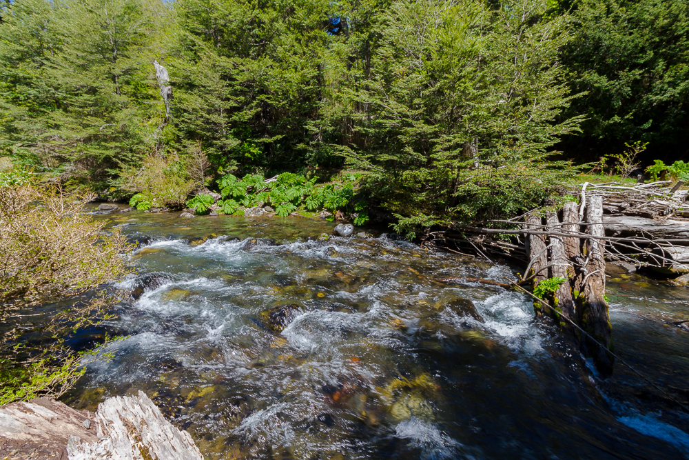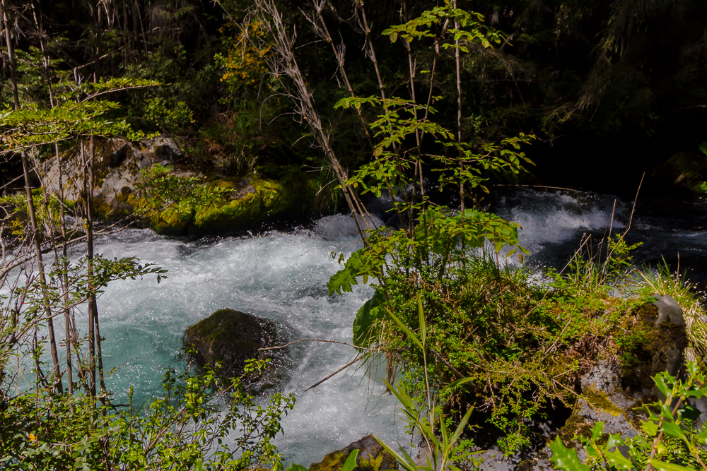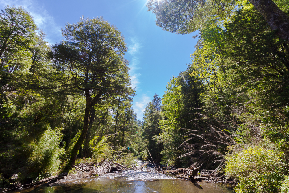 Den Samstag haben wir dann entspannt abseits aller Zivilisation angegangen. Nach dem Frühstück haben wir erst einmal ein wenig Postkarten und Reisetagebuch geschrieben und gegen 13:00 Uhr sind wir dann auf eine Wanderung durch den Wald aufgebrochen. Der Wald ist einfach toll, bis auf den kleinen Trampelpfad ist er nicht bewirtschaftet und ursprünglich. Über den Bach mit Wasser aus dem Eisfeld des nahen Vulkans führen nur dicke Baumstämme und zum Glück auch ein kleinerer Ast zum Festhalten.