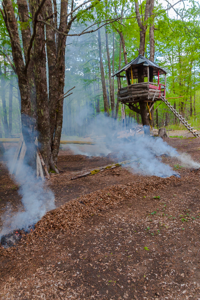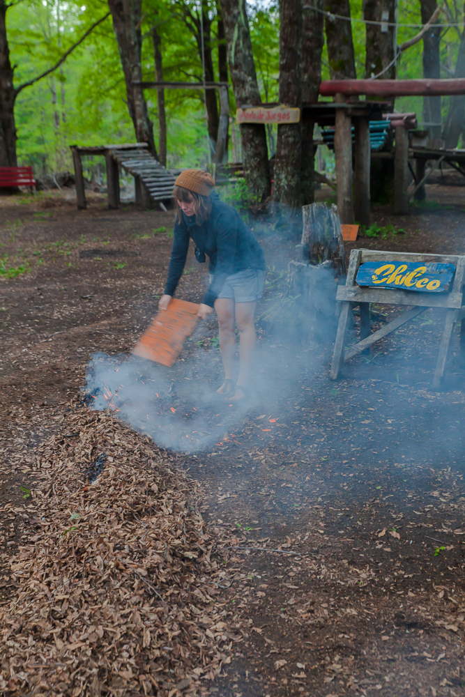 So ca. 17:30 Uhr kam Feli zu uns und hat uns gesagt, dass sie und Vera jetzt das von ihnen zusammengerechte Laub anzünden wollen. In der Hoffnung auf tolle Fotos sind wir natürlich direkt mitgegangen und es hat sich auch gelohnt. Da das Laub noch ein wenig feucht war, haben wir uns entschieden, erst einmal ein Lagerfeuer aus den umherliegenden Holz anzuzünden und dort dann das Laub zu verbrennen. Letztendlich sind wir erst halb 12 wieder in unserer Hütte gewesen, da uns das Feuer so in seinen Bann gezogen hatte. Judith hat sich zwischenzeitlich auch immer wieder um die Glutstellen in den kleineren Häufchen Laub gekümmert, damit auch dort das Feuer am brennen bleibt. Zwischenzeitlich hatte sich auch Christa mit zu uns gesetzt und sich mit um das Feuer gekümmert. Die Gelegenheit haben wir auch genutzt, Sie zu fragen, ob wir ein paar Tage länger bleiben können, was auch kein Problem war. Wir wollten dann am Montag mit ihr nach Pucón fahren, um einerseits noch Vorräte einzukaufen und eine Tour auf den Vulkan Villarrica buchen.