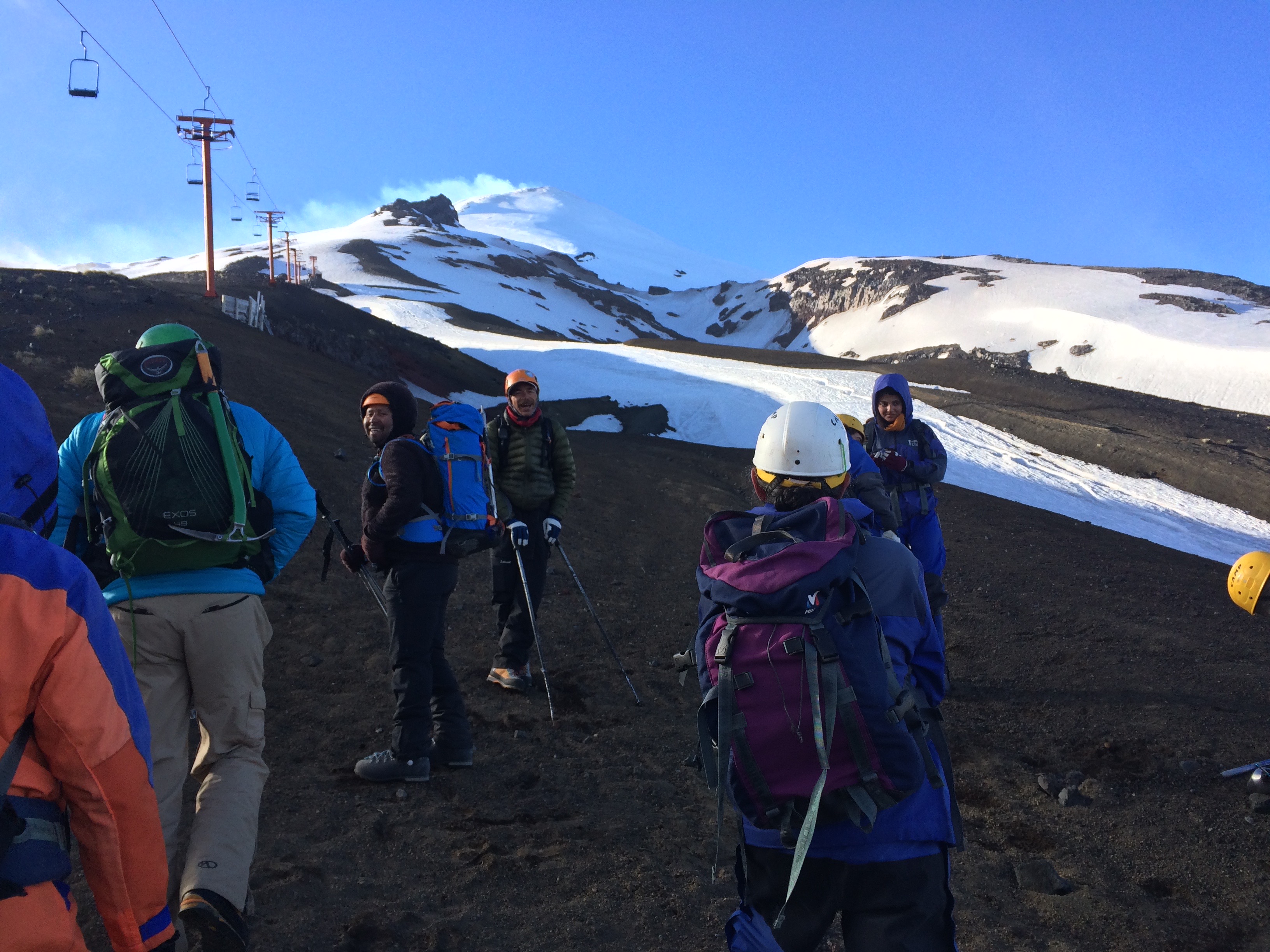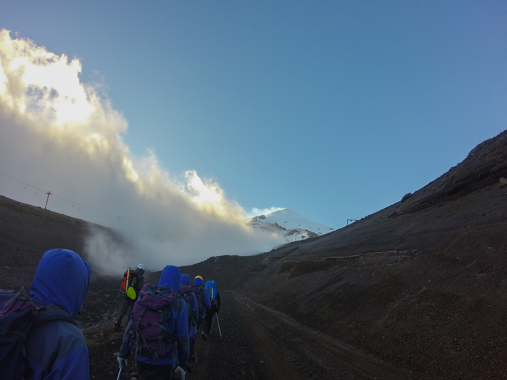 Am Donnerstag hat der Wecker um 5:30 Uhr geklingelt und kurz nach 6 sind wir zur Agentur aufgebrochen. Dort hieß es dann an- und umziehen und den Inhalt unserer Rucksäcke in die gestellten Rucksäcke umpacken. In denen befand sich auch schon eine Atemschutzmaske und Steigeisen. Als irgendwann alle 4 Guides und die 12 Teilnehmer der Tour soweit waren, ging es mit einem kleinem Bus Richtung Talstation des Skigebietes am Vulkan. Die Fahrt dorthin war nach so einer halben Stunde beendet und vor Ort haben wir noch einen Eispickel bekommen. Dann hieß es Helme aufsetzen und nach einer kurzen Einweisung ging es im Gänsemarsch durch die tief hängenden Wolken los.
