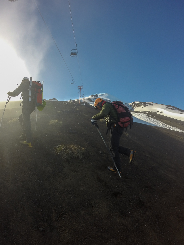 Und da es direkt entlang eines Grates ging, haben wir auch die ein oder andere Windböe abbekommen, die auch mich zur Seite gedrückt hat. War also nicht so einfach und schon gar nicht soooo einfach, wie wir uns das vorgestellt haben. Nach ca. 70-80 Minuten waren wir an der Bergstation der Seilbahn angekommen. Von dort aus dauert es normalerweise noch weitere 4 Stunden unter den gleichen Bedingungen – nur eben ab dann über ein Schnee- und Eisfeld. Da die letzten paar hundert Meter für mich eine Qual waren, habe ich mich dafür entschieden, umzudrehen. Klassischer Fall von überschätzt 😉 Judith ging es zu diesem Zeitpunkt zwar noch besser aber sie war sich auch nicht sicher, bis auf den Kraterrand zu kommen. Nach einer kurzen Rücksprache mit dem Chef- Guide ist sie dann auch gleich wieder mit runter gegangen. Begleitet von einem Guide ging es also Bergab, am Anfang über ein Eisfeld, so dass wir die Steigeisen doch noch einsetzten konnten 🙂