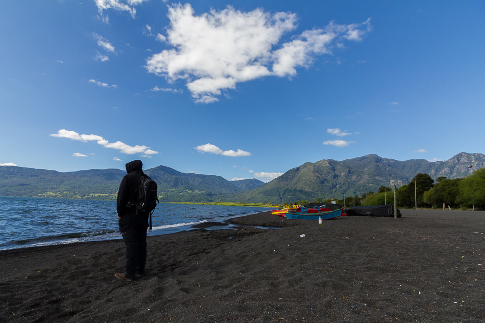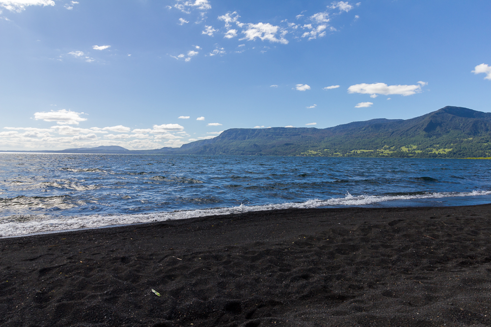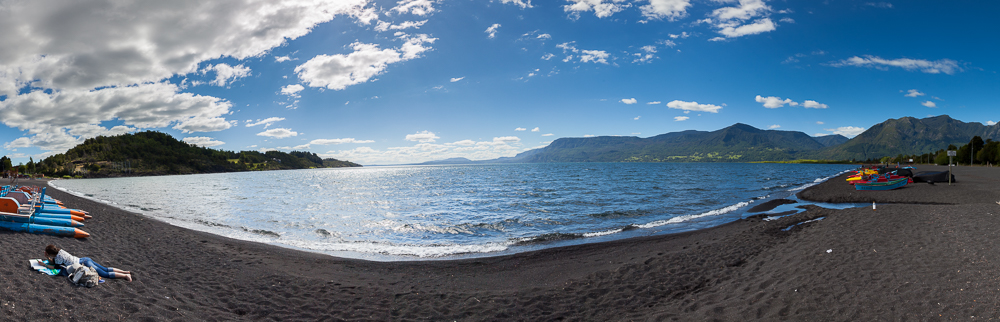 Der Guide hat uns auf dem Weg auch noch Infos zum Vulkan und zu den Mapuche gegeben. Gegen 12 Uhr waren wir dann wieder bei Summit Chile in Pucón und froh, nur noch normale Schuhe anzuhaben. Nach einem Kaffee im Café Berlin sind wir zurück in unser Hostel, um unsere Kameras und Notebooks zu holen, weil wir ein wenig die nächsten Tagen planen, unsere Blogs füllen und Pucón besichtigen wollten. Auf dem Rückweg in die Stadt haben wir noch meine normalen Halbschuhe beim Schuster abgegeben. Diese sollten am Freitag gegen 4 fertig sein. Im Café Cassis sah es dann aus wie in einem Büro, leider war die Internetverbindung nicht so gut ( wie auch im Hostel). Für die Buchung der nächsten Unterkunft in Puerto Varas und ein paar Mails hat es aber gereicht. Danach ging es noch zum schwarzen Strand von Pucón und auf dem Weg zurück gleich noch die Bustickets zu unserem nächsten Ziel kaufen.