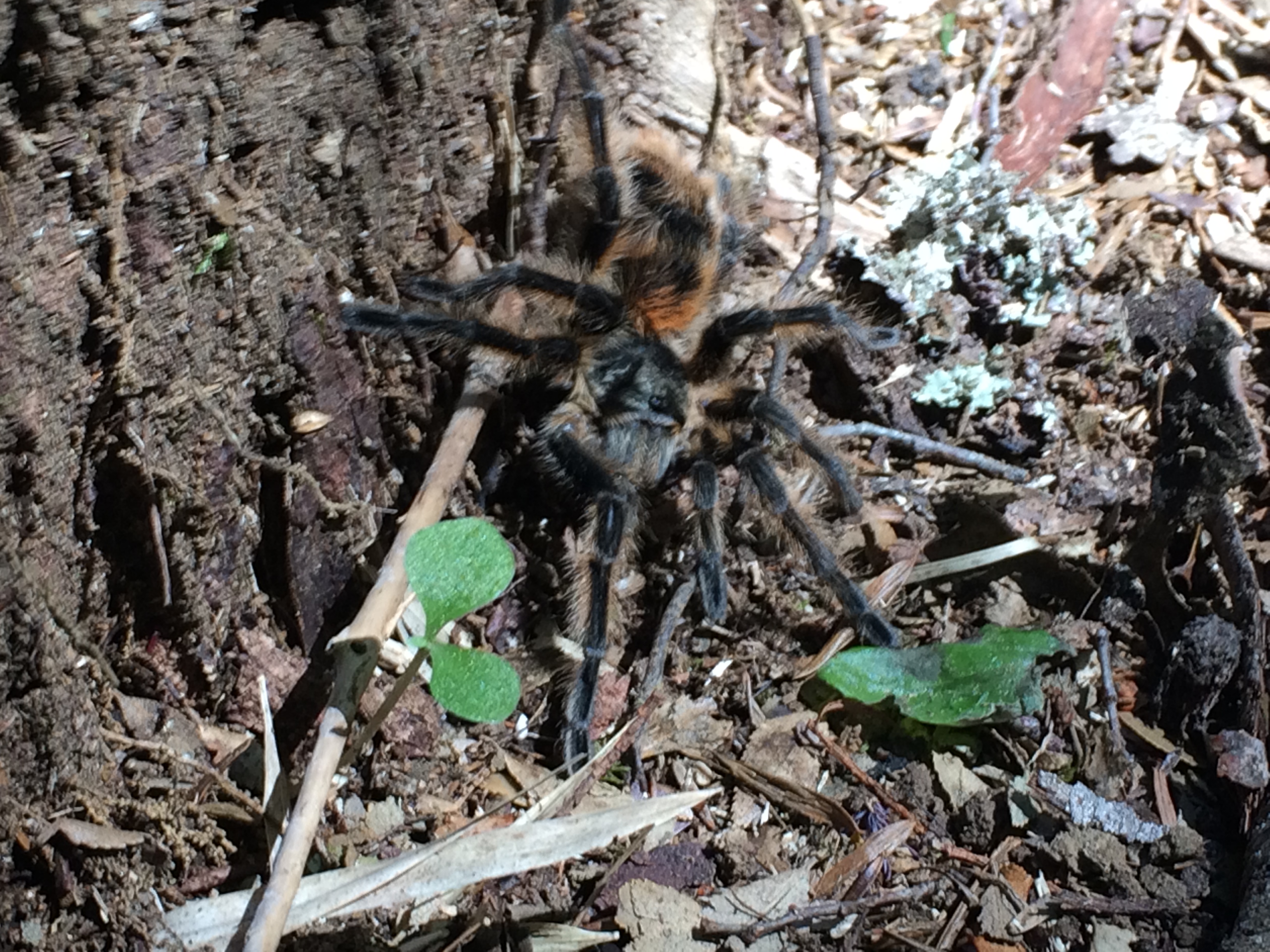 Mitten im Wald sind wir auch auf eine kleinere, braune Vogelspinne getroffen. Wir hielten an für Fotos und Videos. Ein Pärchen kam uns entgegen, der Mann machte auch Fotos, die Frau hielt richtig viel Abstand und rannte dann daran vorbei..