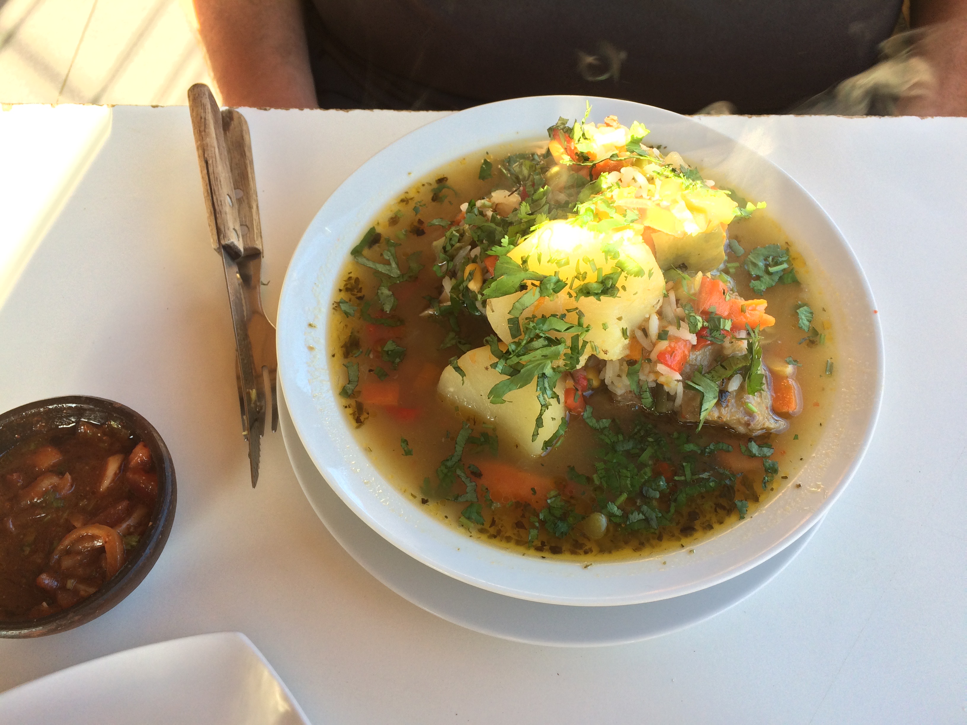 Zum Abendessen sind wir ein ein kleines Lokal gegangen und es gab Cazuela, eine Art Eintopf und das war super lecker. Die Zwei Knochen vom Fleisch haben wir für Max, den Hund vom Hostel, mitgenommen.