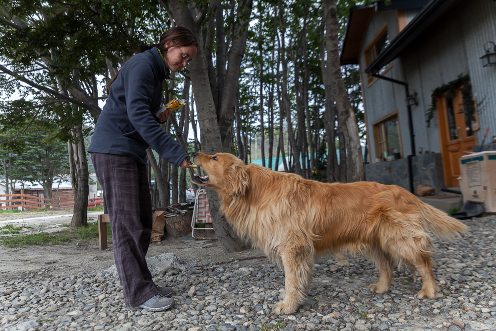 Auch am Samstag das gleiche Bild wie die Tage davor, auf kurze Momente von Sonnenschein folgten dunkle Wolken. Wir sind dann trotzdem mal eine kleine Runde durch die Siedlung oberhalb von Ushuaia gelaufen. Mit uns mitgekommen ist Fuchur und hat auf uns aufgepasst – und wir auf sie. In den Wiesen gibt es ziemlich viele Kletten und wir haben ihr beim Rausmachen aus dem langen truppeligen Fell geholfen. An einem Zeltplatz ist sie wegen zwei anderen Hunden dann mal nicht weitergelaufen, was zuvor bei anderen Hunden kein Problem war. Das haben wir dann auch so verstanden, dass wir den Weg besser nicht gehen 😉 Über die Reste vom Mittagessen hat sich sich dann auch gefreut. Wir haben auch rausgefunden, dass die Hündin eigentlich zum Haus gegenüber gehört. Über Nacht hat sie von uns eine Mülltüte vor der Tür aufgebissen und den ganzen Müll vor ein Holztor bei Ihrem zu Hause abgelegt. Wie auch immer man das verstehen kann 🙂