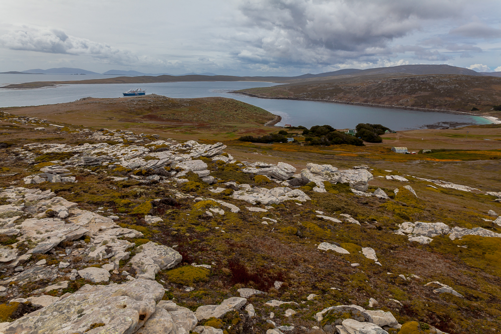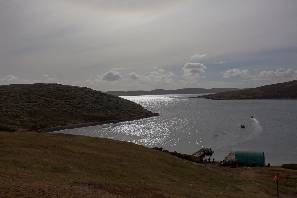Oben auf dem Hügel hatten man noch eine schöne Sicht auf das ankernde Schiff in der Bucht. Aus einem zweiten Landrover wurde uns dann aber 10 Minuten später signalisiert, wir sollen wieder runterkommen. In der Nähe der Landestelle gab es im Haus der Inselbewohner – 2 an der Zahl – noch Kekse und Tee aus feinsten englischen Porzellan, ziemlich komisch so etwas auf einer Insel am Ende der Welt zu sehen.