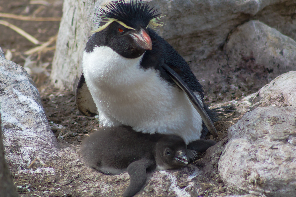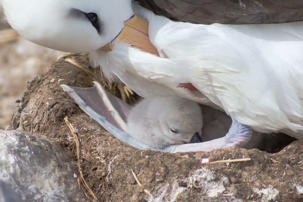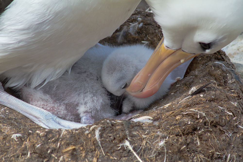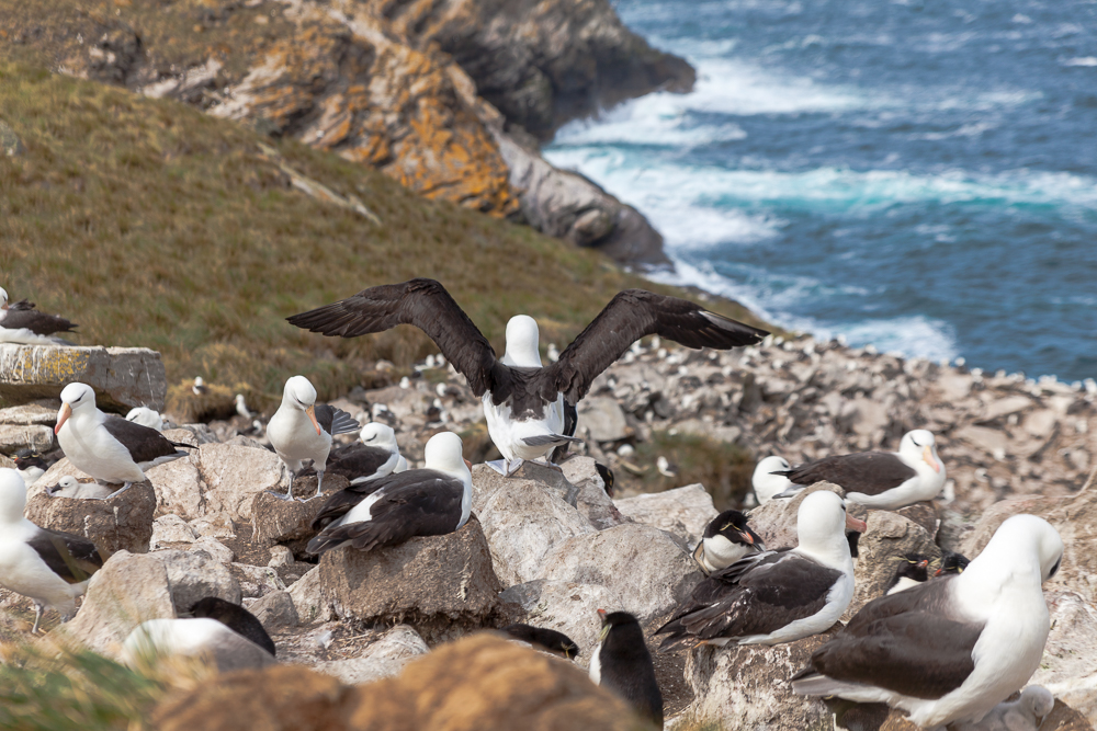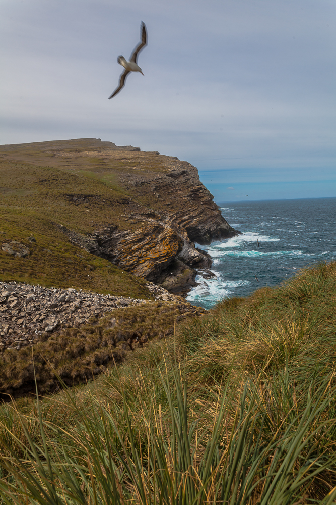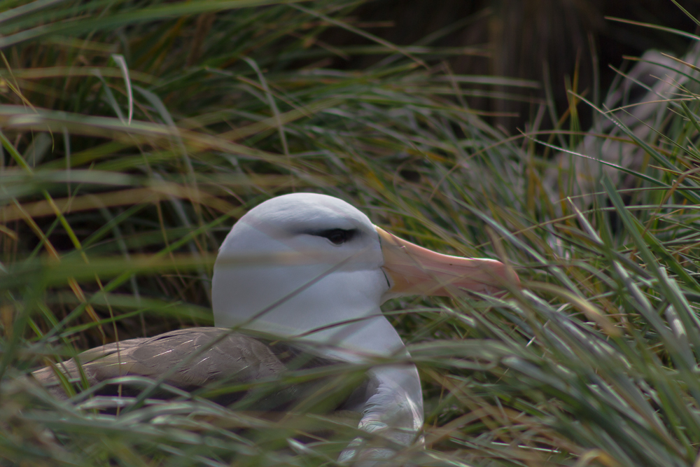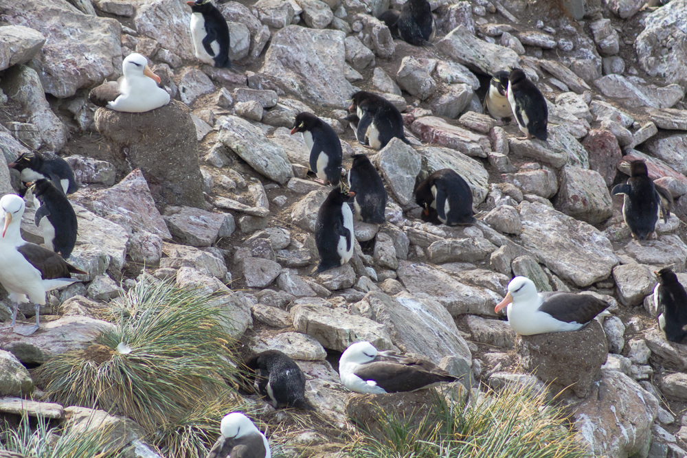 „Devils Nose“, eine Klippe, ist ein Brutplatz von Schwarzbrauenalbatrosen und Felsenpinguinen. Die Tiere nisten in verschiedenen Gruppen quer durcheinander. So geben die Albatrosse den deutlich kleineren Pinguinen Schutz und auch anders herum. Mögliche Angreifer haben da kaum eine Chance. Das war einfach toll, das Spektakel mit ansehen zu dürfen. Sowohl die Pinguine als auch die Albatrossen haben den nur 1-2 Wochen alten Nachwuchs in den Nestern gehabt.