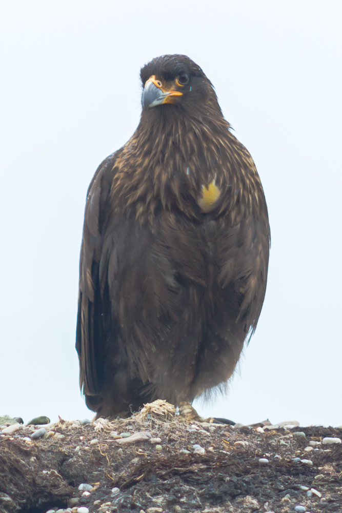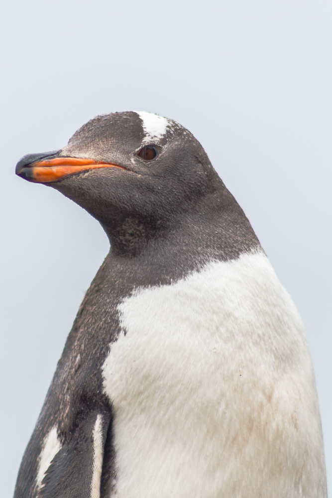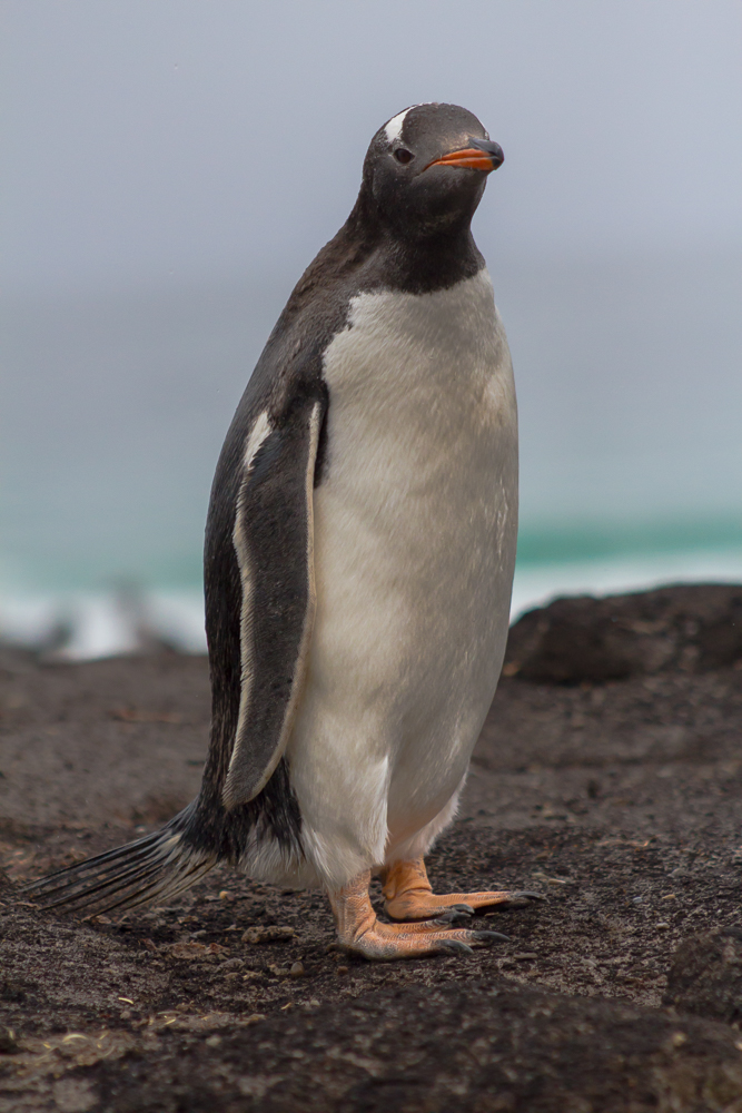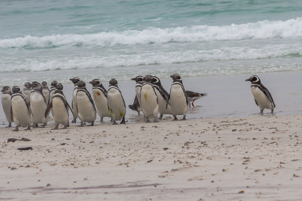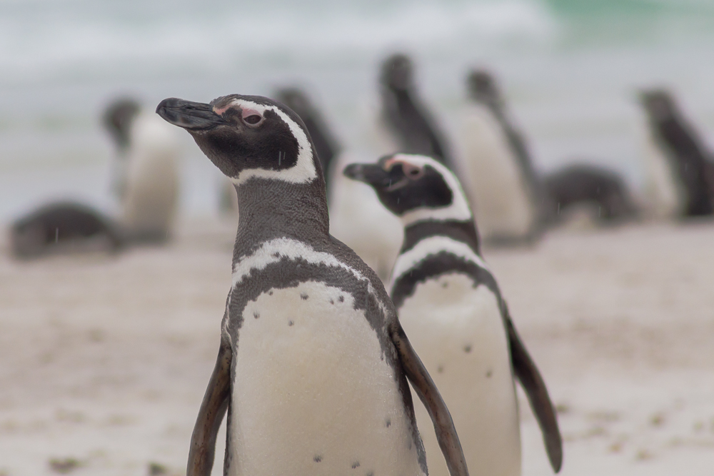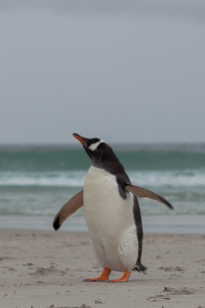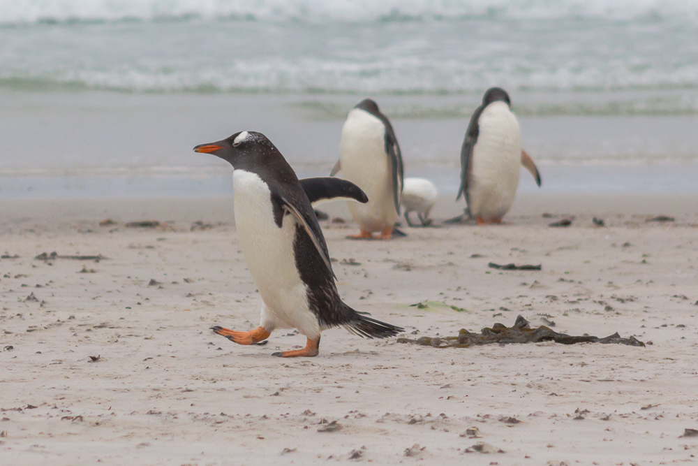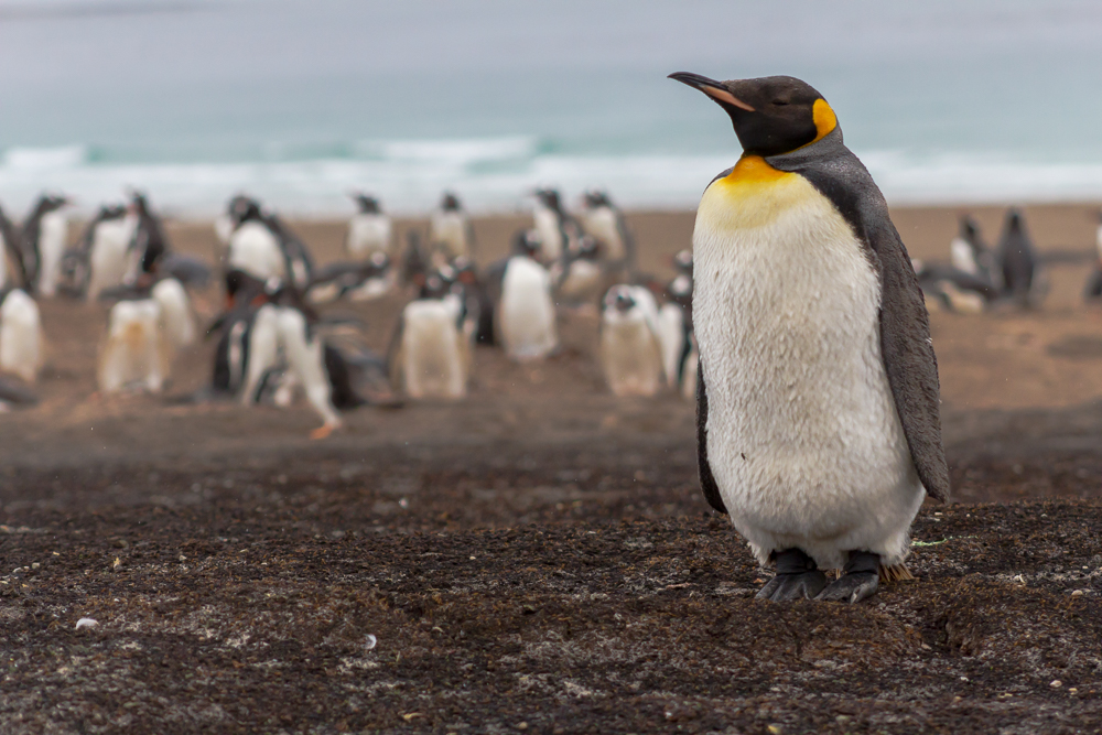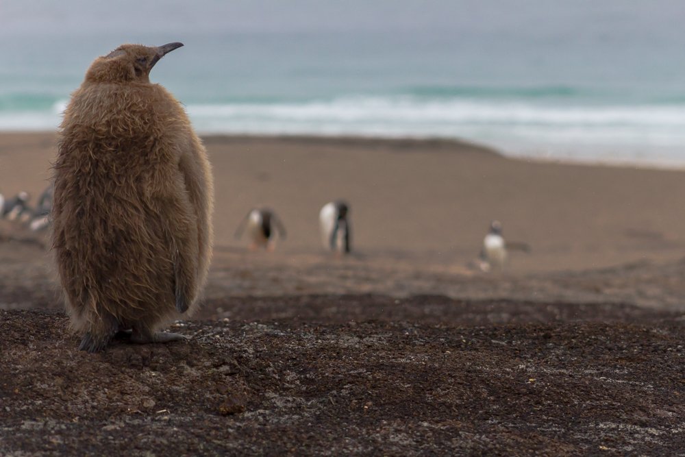 Während des Mittagessens an Bord ist dieses weiter nach Saunders Island, der zweitgrößten Insel neben den Hauptinsel, gefahren. Dort ging es dann wieder mit den Zodiacs an Land. Direkt am Landpunkt war auch gerade eine Gruppe Magellanpinguine. Wir haben uns dort aber nur kurz aufgehalten und sind auf die andere Seite der Insel zu einem Strand gelaufen. Auf dem Weg dahin ging es an unzähligen Pinguinen, eine Schaf und einem Wal-Skelett vorbei. Am Strand selbst sind hunderte Puinguine, zum größten Teil Magellan– und Eselspinguin, die sich erst einmal säubern, nach dem sie aus dem Wasser gekommen sind. Auch ein Königspinguin stand einsam und fast regungslos am Strand, scheinbar so, als würde er über die anderen, deutlich kleineren, Artgenossen wachen.