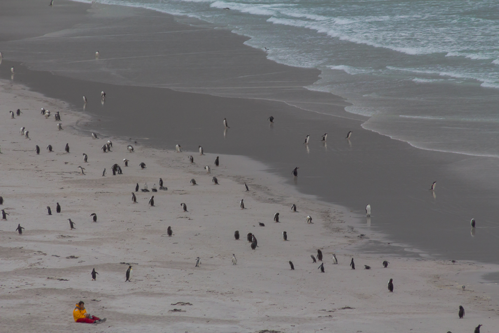 Ich hatte mich auch mal für einige Minuten in den Strand gelegt, denn wir dürfen nur 5 Meter an die Tiere heran, aber wenn diese auf uns zu kommen, ist es ok. Und um so kleiner man wirkt, um so weniger bedrohlich ist man für die Tiere. Ob ich mit meiner Statur in einer knallgelben Jacke und einer roten Hose auf dem Strand liegend umbedrohlich wirke… nunja, an diesem Tag kam noch kein Pinguin näher an mich heran 😉