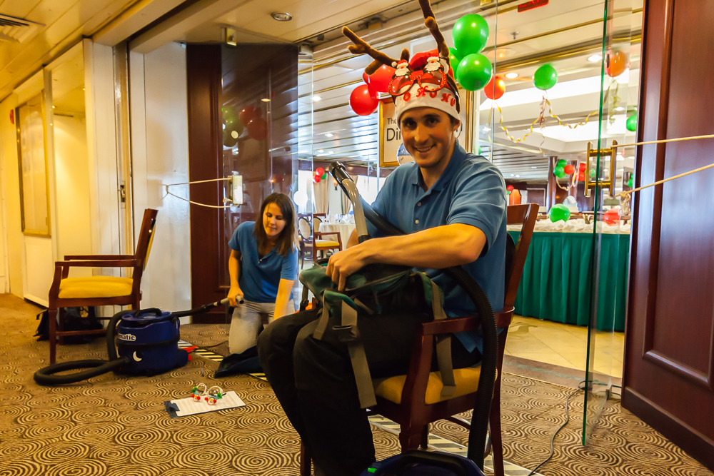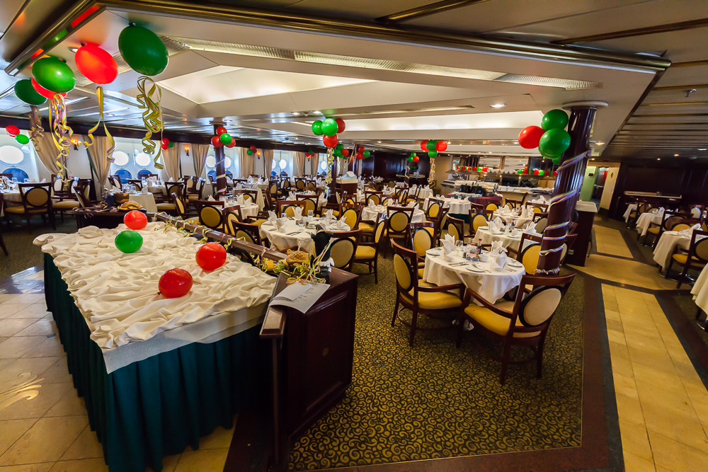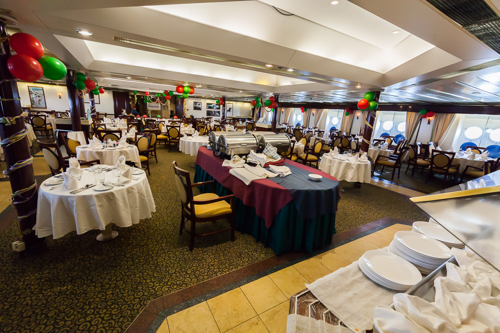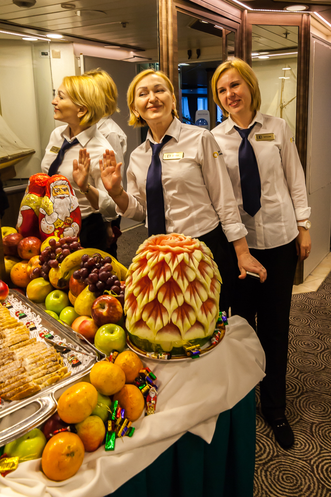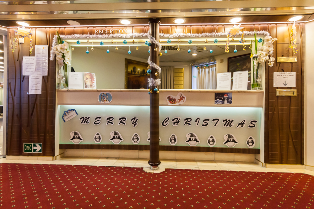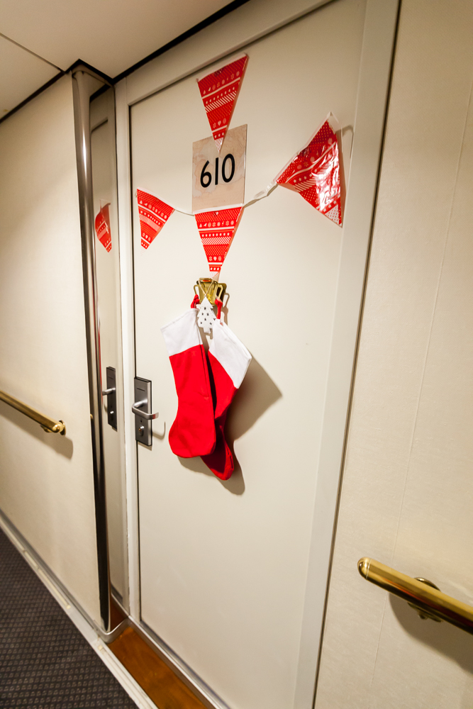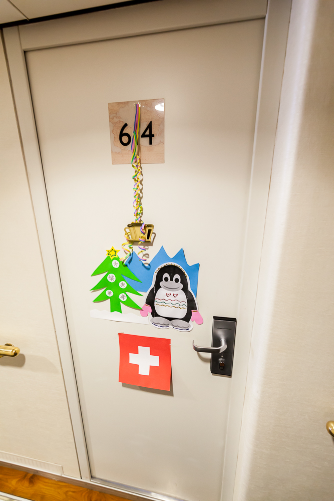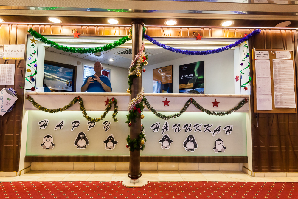 Eine Zusammenfassung des Tages gab es diesmal nicht, war ja auch nicht so viel los und der nächste Tag war auch ein reiner Seefahr-Tag. Um 19:00 Uhr gab es dann Abendessen und im Unterschied zu den Abenden davor wurde das „Dessert“ ein Deck oberhalb im „Club“ serviert. Serviert ist da auch das falsche Wort: der ganze Gang dahin stand voll mit Eis, Kuchen und Torten, Obst, Irish Coffee und naja, was es eben so an Süßkram gab. Im Club selbst wurde dann durch einige jüdische Mitreisende der erste Abend von Hanukkah begangen und in einer kleinen Zeremonie das erste Licht der Menorah angezündet. Bevor es dann zu den christlichen Weihnachtsliedern kam, haben wir uns aber verdrückt 😉