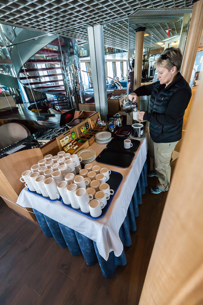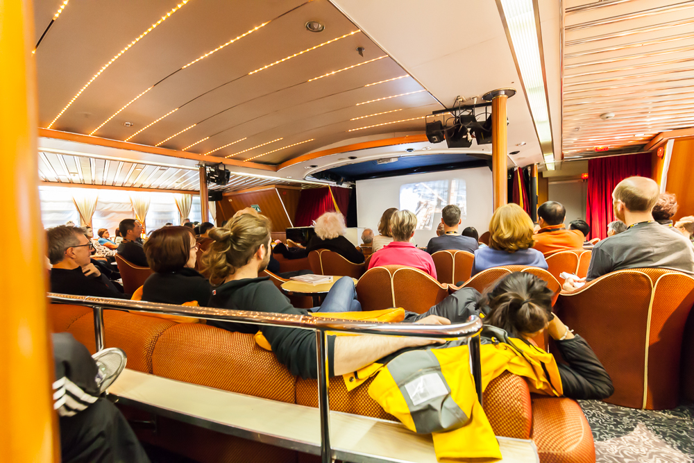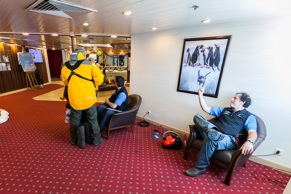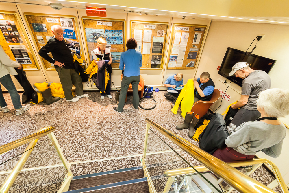 Um 14:00 Uhr gab es dann eine Pflichtveranstaltung zur Sicherheit auf Südgeorgien in Form eines ca. 60 Minuten langen Videos – gefühlt war der halbe Raum kurz vorm Einschlafen: die Anti-Seekrankheits-Pillen machen auch müde.