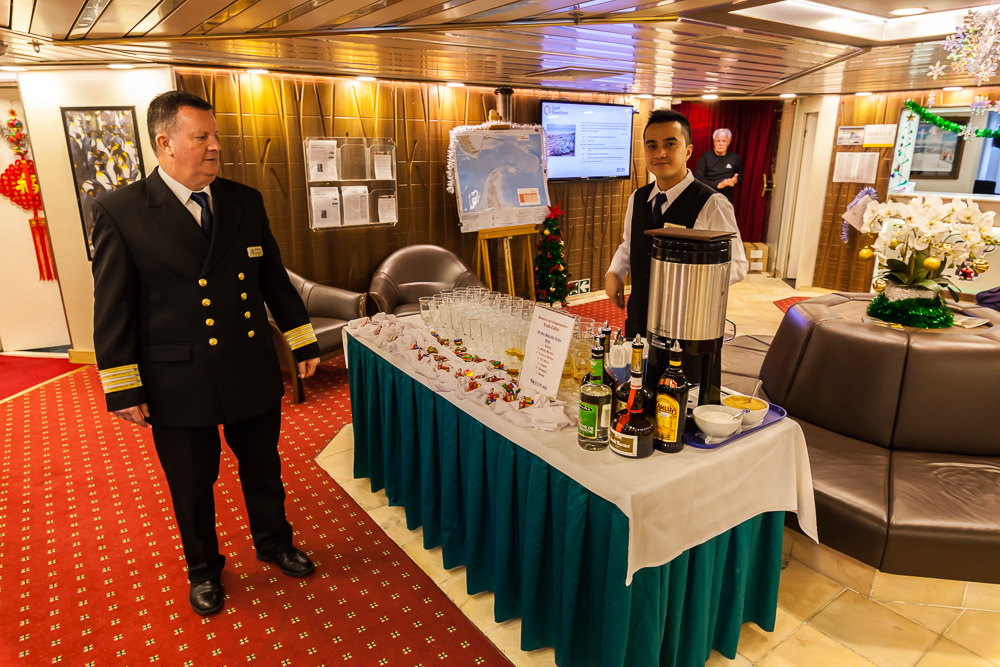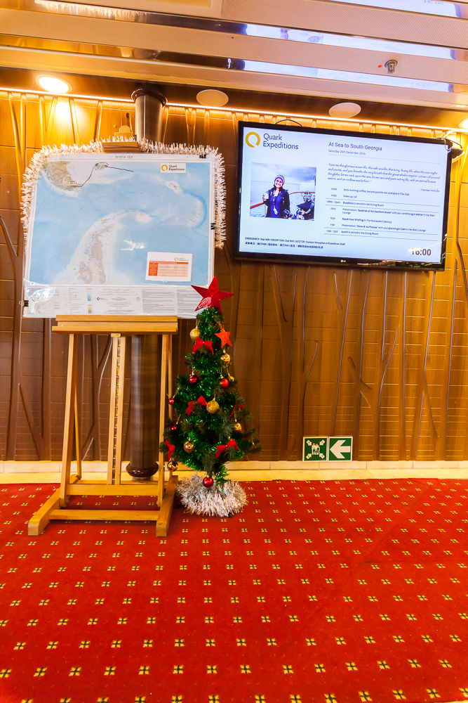 In der Nacht vom Samstag auf den Sonntag (25.12.2016) war eine Zeitumstellung (von deutscher Zeit -4h auf deutsche Zeit -3h) und zum ersten mal seit Beginn der Expeditionsfahrt konnten wir etwas länger liegen bleiben, da der Weckruf erst um 9:30 durch das Schiff hallte. Mit eigentlich immer noch vollen Bäuchen sind wir zum Weihnachtsbruch gegangen. Weihnachten ist nicht nur in Deutschland das Fest der Völlerei 🙂 Ab 11 Uhr haben wir uns dann in die Lounge gesetzt und noch ein wenig Fotos bearbeitet und Texte geschrieben. Außerdem auch ein paar Postkarten, die wir in Süd-Georgien abgeben wollten (es gibt in Süd-Georgien drei offizielle, von der britischen Regierung eingesetzte, Offiziere und einer von denen betreibt nebenbei die Post – obwohl die Insel nicht dauerhaft bewohnt ist). Eigentlich wollten wir am Nachmittag auch zu einer Präsentation zur Geologie der Falklandinseln und von Südgeorgien, aber die wurde verschoben – warum haben wir nicht verstanden 😉 Dafür gab es dann aber Häppchen, mit Lachs und Salami! Also so richtig essbarer Salami. Mit Geschmack. Mit Pfeffer. Und auf einer Art Vollkornbrötchen. Und wenn wir auf der Reise bzw. an diesem Tag etwas gelernt haben: an Weihnachten hat alles Null Kalorien 🙂