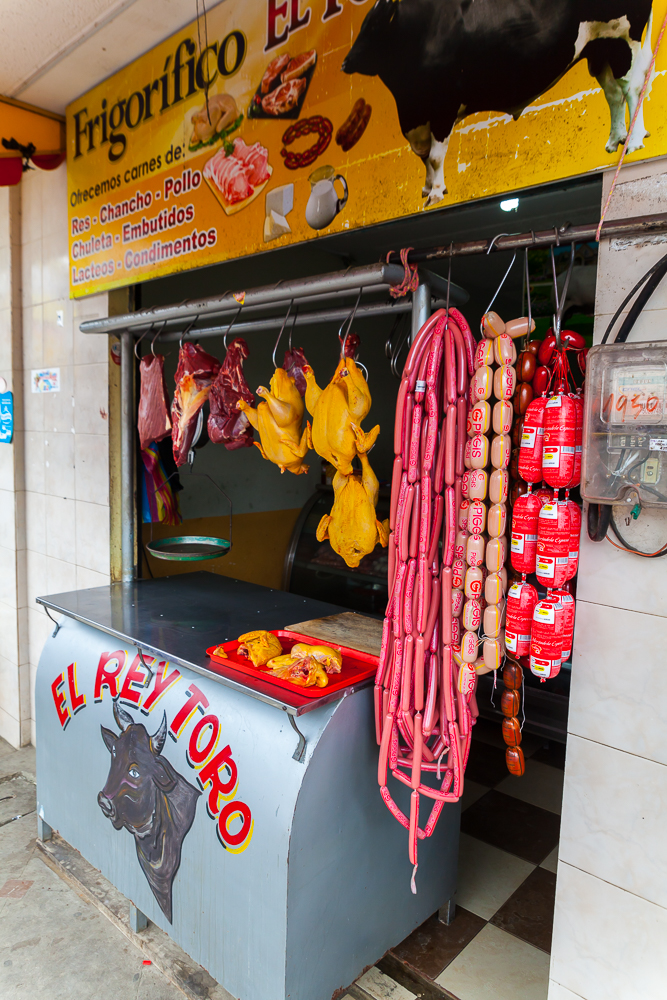 Kaum hatten wir eine Fleischspieß in der Hand, find es zu regnen an. Wir stellten uns zu den Einheimischen unter – nur ein paar Jugendliche auf dem Marktplatz juckte das Wetter nicht. Das nächste Ziel war der lokale Fleischer/Käseladen. Für beides ist das Dorf bekannt. Wir durften 4 Sorten Käse testen und Schinken. Alles schmeckte nach etwas 🙂 Die Salami konnten wir nicht probiert – kauften wir dann nach Geruch trotzdem, zusammen mit einem Pfund Käse. Die Salami war tatsächlich die beste Wurst in ganz Südamerika – für Thüringischer Verhältnisse Mittelmaß aber für hier, einfach toll 🙂