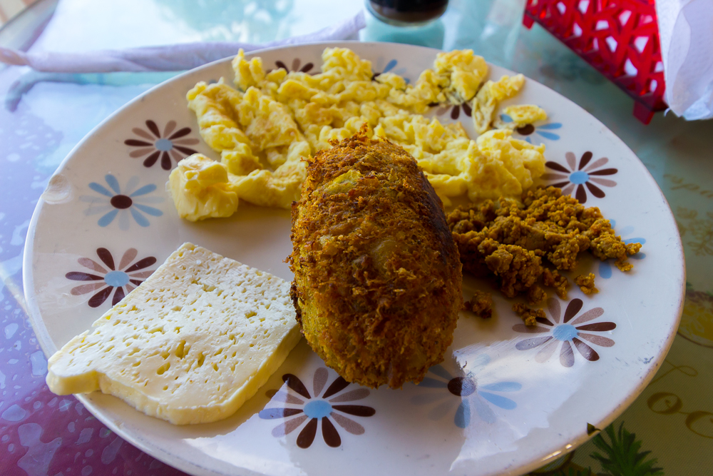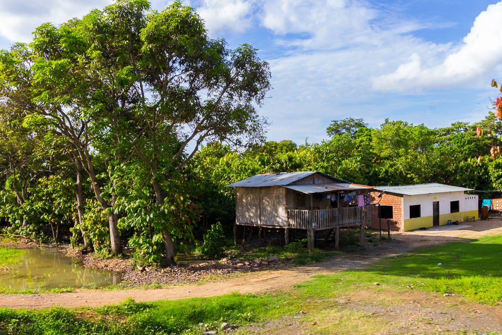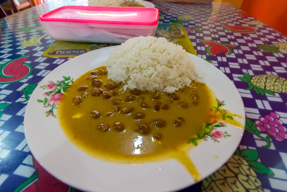 Zurück in der Stadt brachten wir unsere Sachen ins Hostel und gingen dann auf einen kolumbianischen Kaffee in die Stadt. Als wir dann auch langsam Hunger bekamen, gingen wir ein paar Straßen von Strand weg und fanden ein Restaurant, bei dem es für 3 Dollar pro Person wieder richtig leckeres lokales Essen gab: Bohnen mit Reis (hat an Kuba erinnert), über Holzkohle gegrilltes Schwein oder Huhn mit frittiert Bananenscheiben und Salat – echt großartig. Den Abend verbrachten wir dann auf der Terrasse im Hostel.