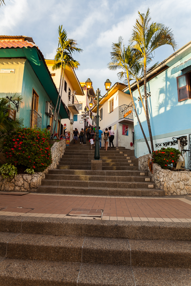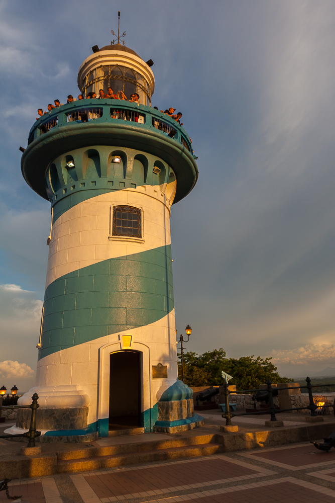 Gegen 18 Uhr erreichten wir dann den Hügel Cerro Santa Ana am Ende des Malecon. Der Hügel ist mit vielen bunten Häusern bebaut und nach 444 Treppenstufen gab es von dem Leuchtturm auf dem Hügel aus einen super Rundumblick kurz vor Sonnenuntergang.
