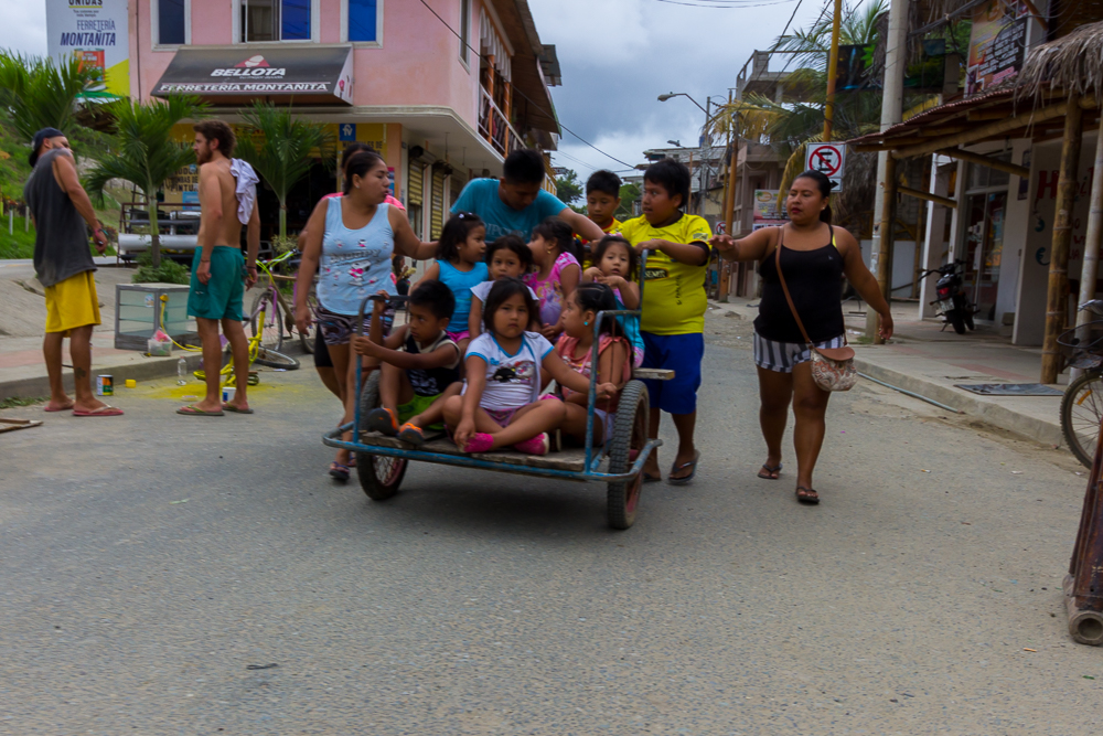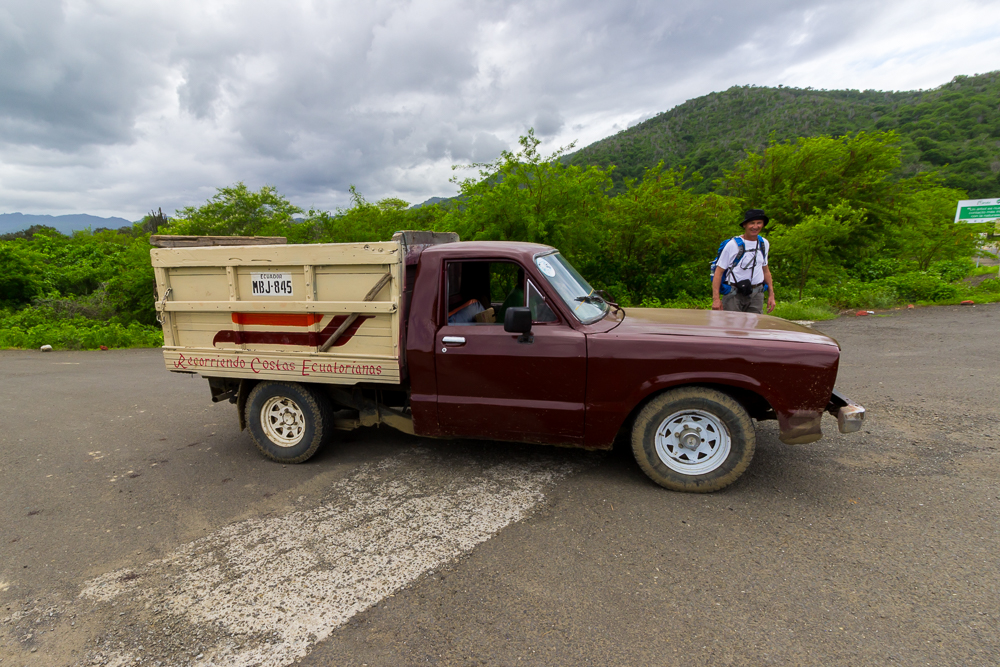 Nach einer Stunde an der Lagune ging es zurück zum Dorf. Dort fragten wir Milton, ob er 2 Taxis rufen kann – auf den Rückweg zu Fuß hatten die Kanadier und auch wir keine Lust. Glücklicherweise parkte gerade ein kleiner Lieferwagen aus und Milton fragte, ob der Fahrer uns 6 bis zur Straße mitnehmen könnte – was auch kein Problem war. Die beiden Frauen konnten noch in das Fahrerhaus und die zwei Männer sowie Judith und ich kletterten auf die Ladefläche und setzten uns auf die ca. 20 Gasflaschen – was kann schon passieren 🙂 Die Fahrt jedenfalls war toll. An der Hauptstraße ließ uns der Fahrer raus und keine 5 Minuten später kam auch ein Bus Richtung Puerto Lopez vorbei. Die 4 Kanadier sind dann weiter nach Montañita gefahren – unserem nächsten Ziel noch etwas südlicher an der Küste.