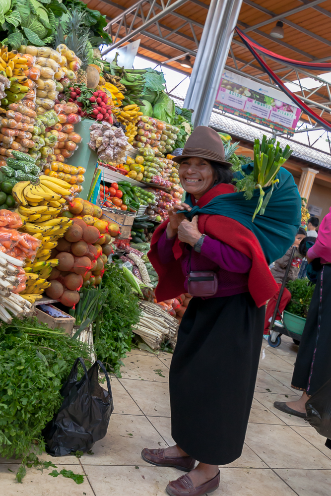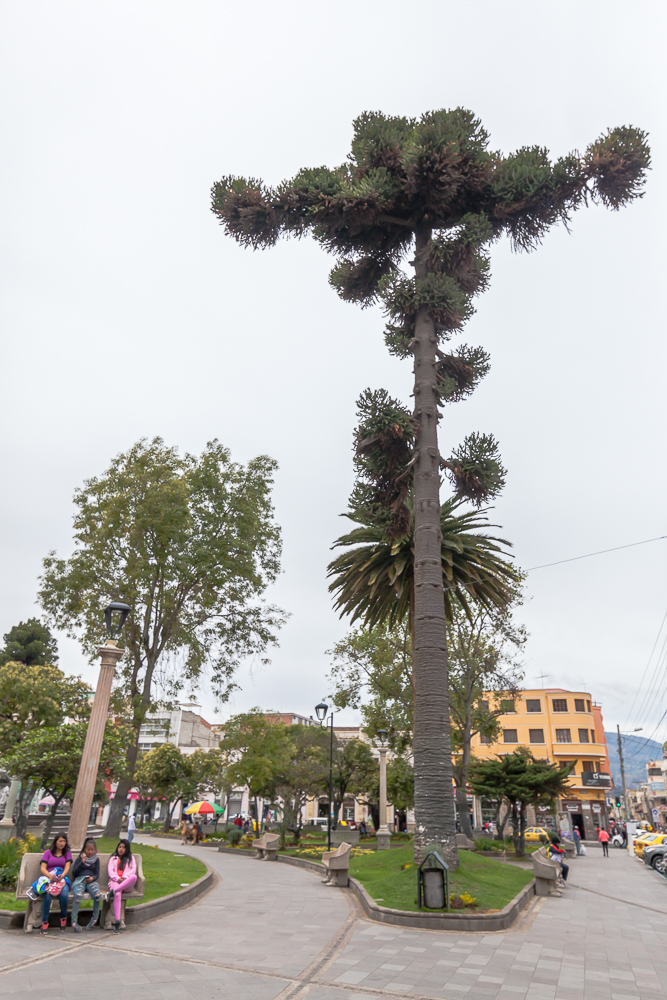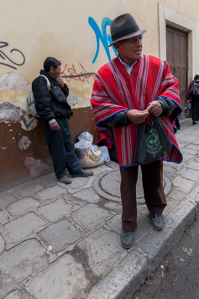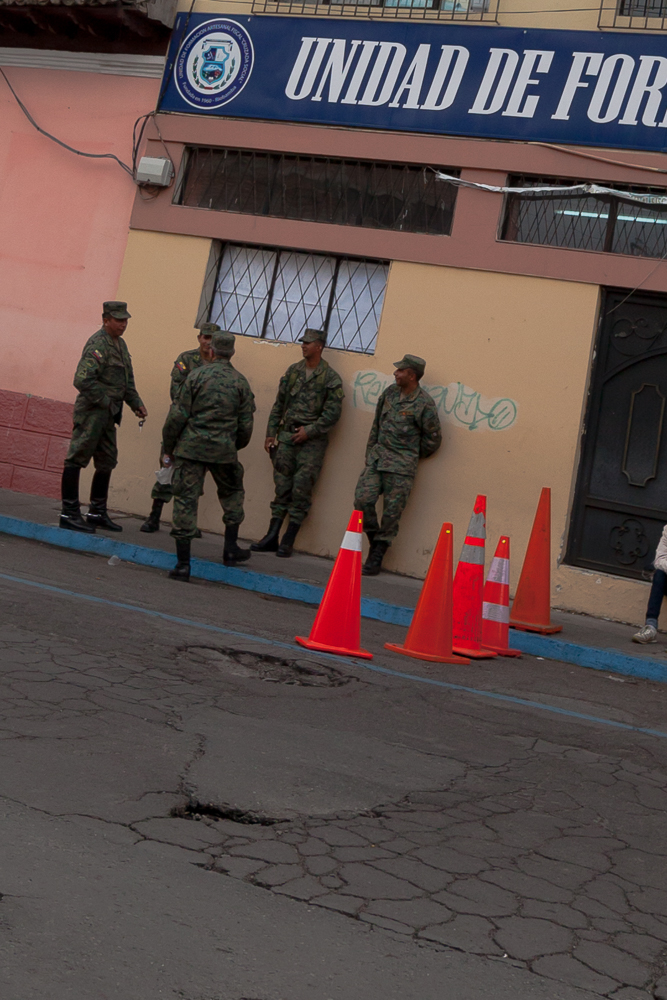 Am Nachmittag gingen wir noch mal los und liefen irgendwann durch eine Straße, in der gerade ca. 10 Busse parkten und es vor Militär mit Gewehren nur so wimmelte. Das war schon komisch und wir redeten uns ein, dass die nur zum Shoppen hier sind. Auf einem Marktplatz vor einer der vielen Kirchen fand dann auch gerade ein Wochenmarkt statt – hätten wir uns nicht schon jeder mit einem Poncho eingedeckt, wäre es dann hier wohl so weit gewesen. Das mit dem Militär klärte sich auch auf, als wir wieder zurück waren und den Chef  – Wolfgang – der Unterkunft kennen lernten. Wolfgang ist seit 25 Jahren mit einer Ecuadorianerin verheiratet und lebt hier. Er erzählte uns, dass für die Präsidentschaftswahlen am nächsten Tag aktuell alles Vorbereitet wird und diese Vorbereitungen werden eben hier so geschützt.