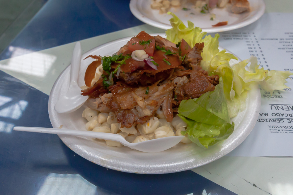 Der Reiseführer verriet uns, dass am Samstag in einen der vielen Märkte der Stadt ganze Schweine gerillt werden. Das war dann auch am 18.02.2017 nach dem Frühstück (Brötchen vom Ort und Marmelade aus Guayaquil, Kaffee und Erdbeersaft) unser erster Weg. Im Markt Merced gab es Obst und Gemüse, Fisch und Fleisch und in einem extra Bereich waren ca. 15 Stände, hinter denen jeweils 2 Frauen um mögliche Kunden für ihre Schweinestücke warben. Wir wurden jedenfalls von vielen Seiten angewunken und angesprochen. Wir probierten erst ein Stück und teilten uns dann eine Portion Mote (Mais) mit gegrillten Schweinefleisch. Über ein paar Umwege ging es zurück zur Unterkunft (unter anderen wollten wir zur Touri-Info, die leider schon zu hatte). Dort traf Judith durch Zufall eine ihrer Mitschülerinnen aus der Sprachschule in Valparaiso vor 4 Monaten wieder – die Welt ist klein 🙂
