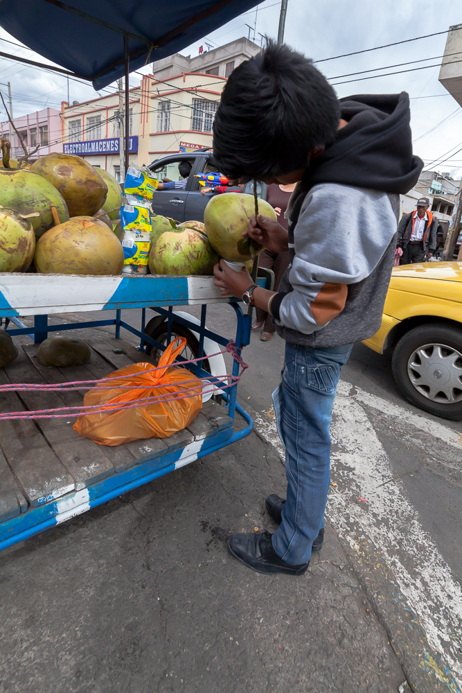 Den Sonntag starteten wir gemütlich und nutzten die Zeit vor allem, um mit unseren Familien zu telefonieren und die Fotos der letzten Tage zu bearbeiten. Außerdem quälten wir den Saftmixer 🙂 Kurz nach 14 Uhr machten wir uns auf den Weg zu einen der kleinen „3$-Restaurants“, welches im Reiseführer erwähnt wird. Nach ein wenig mehr als einem Kilometer durch die Stadt wurden wir leider enttäuscht – das Lokal war zu. Durch die Mittagssonne, die auf der Höhe auch ganz schön stark war, ging es dann zurück Richtung Zentrum, doch so richtig konnte uns nichts zusagen oder es war voll. Auch am Mercado Merced war Hochbetrieb.. Letztendlich sind wir zu „Happy Pollo“ – Glückliches Hühnchen und teilten uns dort eine Portion Huhn mit Pommes. Am Ende so etwas wie KFC nur deutlich besser. Erst  am Abend gingen wir erneut vor die Tür und zu unserer Überraschung war auf den Straßen nichts los – wir hatten angesichts der Präsidentschaftswahlen und der Militärpräsens am Vortag eine andere Erwartungshaltung 🙂 Die Stadt wirkte um 20 Uhr fast ausgestorben.