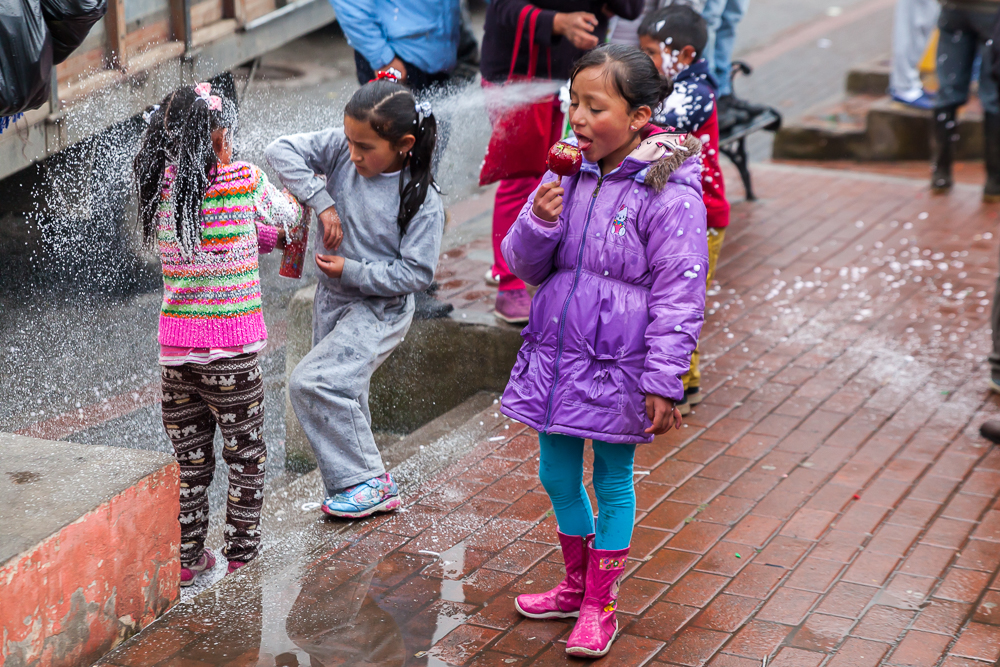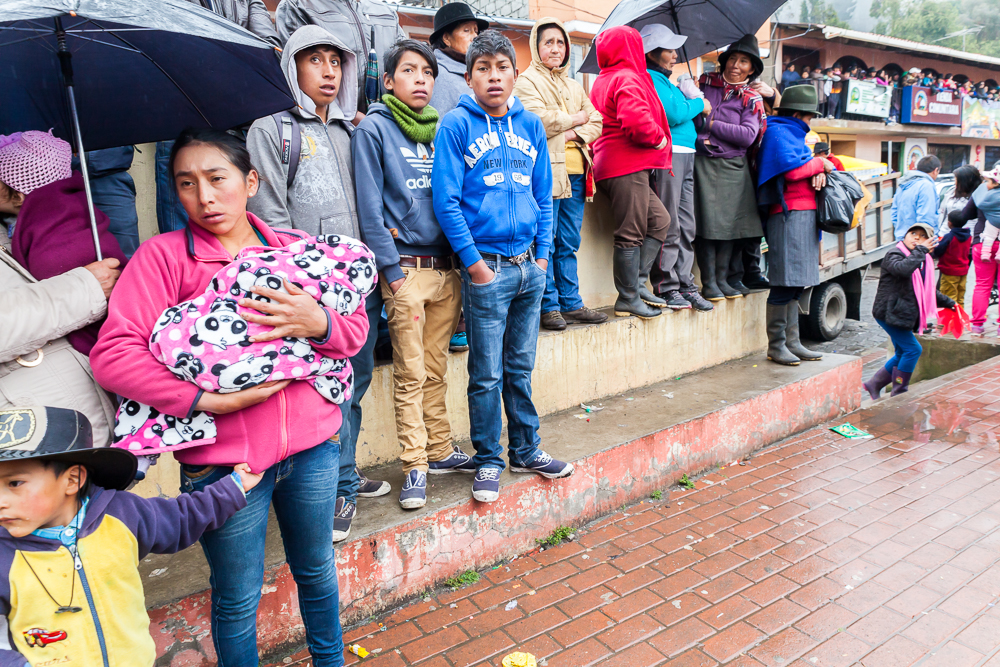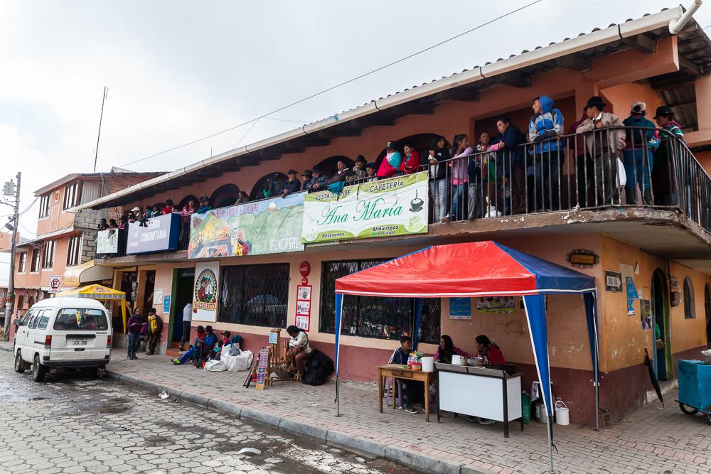 Irgendwann waren alle ausgestiegen und wir machten uns breit – bis erst zwei kleine Mädchen und dann noch eine Frau mit zwei Eimern zustieg. Nach knapp mehr als 30 Minuten war dann Salinas erreicht. Die Fahrt hatte 2 Dollar gekostet – viel Spaß für wenig Geld. Mit dem Gepäck gingen wir zum Hostel und konnten auch gleich in ein Zimmer einchecken. Vom Balkon aus hatten wir eine super Sicht über das kleine Dorf auf 3570 Metern und auf die Berge. Wir gingen direkt zum Marktplatz, auf dem die Vorbereitungen für den Karneval liefen – inkl. ohrenbetäubender Musik.